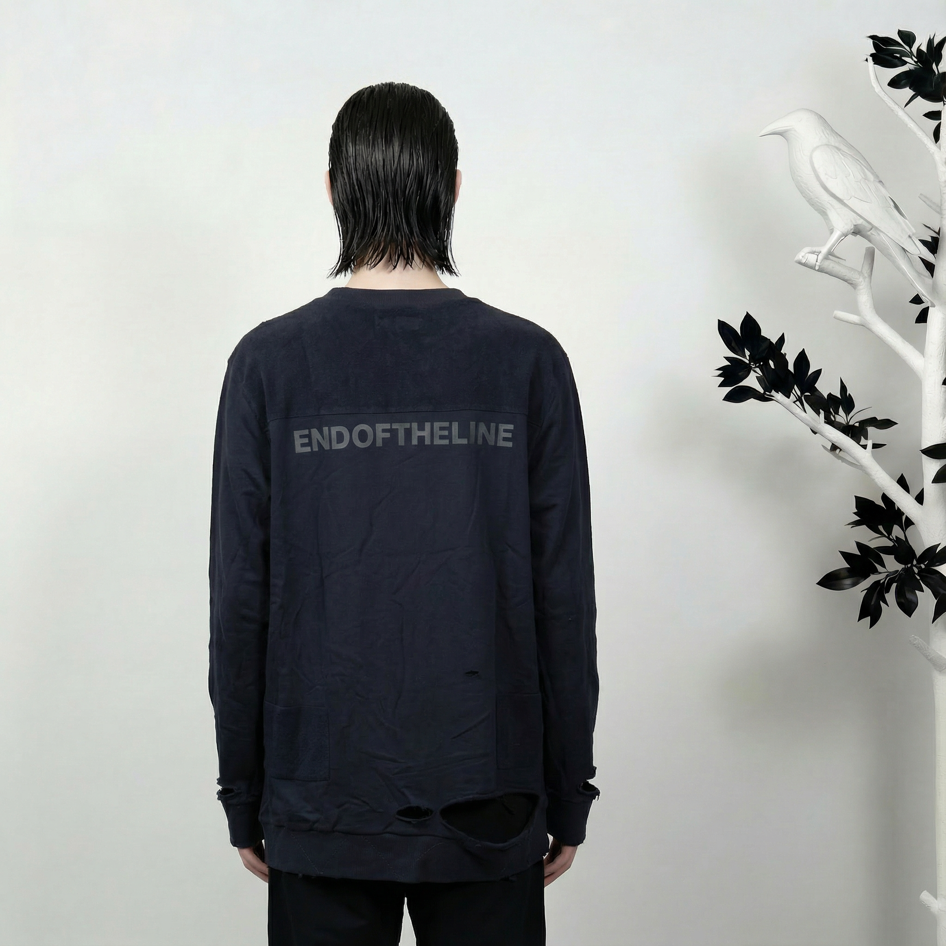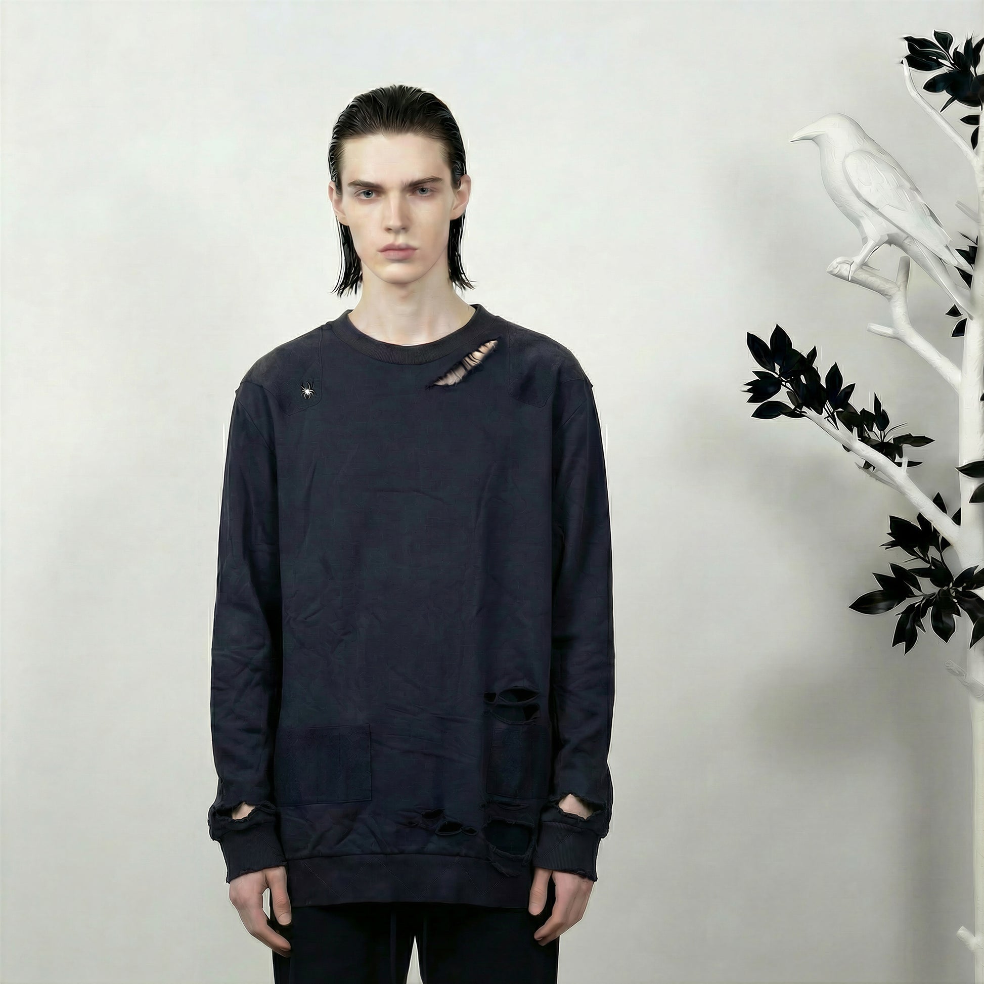 The BV DOZER BLACK pushes contemporary knitwear into conceptual territory. This avant-garde sweater features a striking sterling 925 silver spider embellishment that commands visual attention, while the cryptic "end of the line" text on the back introduces narrative ambiguity. The precious metal detailing elevates the piece beyond conventional sportswear, positioning it as wearable sculpture for those who view fashion as artistic expression. Crafted for individuals unafraid to challenge conventional aesthetics and embrace provocative design statements in their wardrobe.